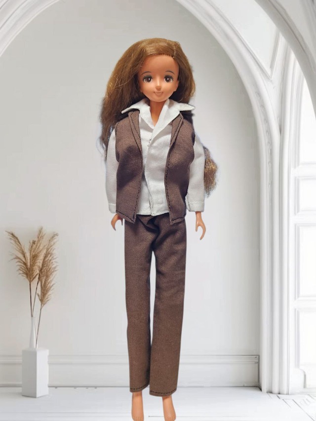 27㎝ドール用アウトフィット3点セット ブラウン×ホワイトのマニッシュコーデ ベスト・シャツ・パンツ