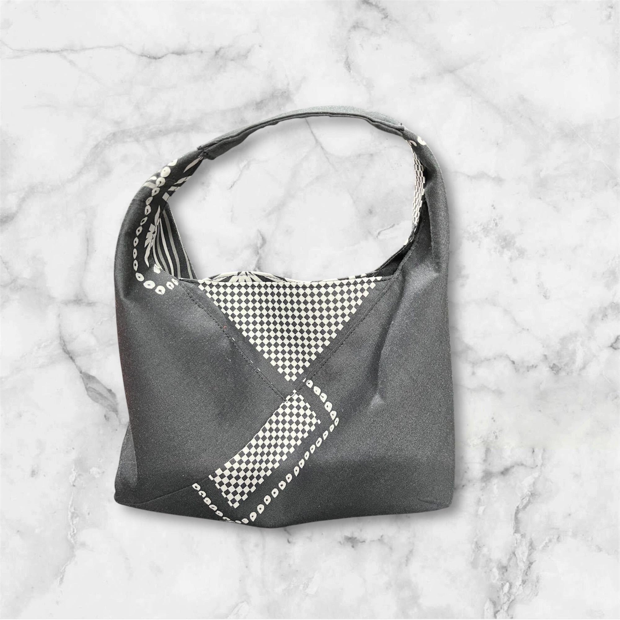 ブロックチェックやストライプなど様々な柄が入ったグレー系のお洒落なバッグです。