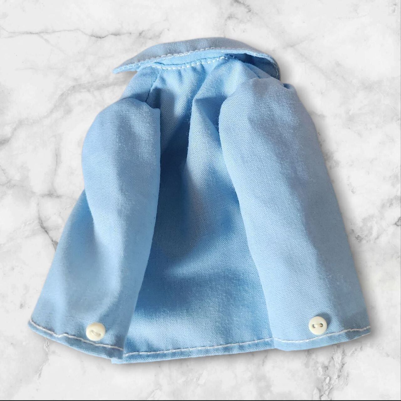 ・長袖シャツ…前スナップボタンどめ。水色生地。袖はあえてふわっとした感じにしており、飾りボタンをつけております。