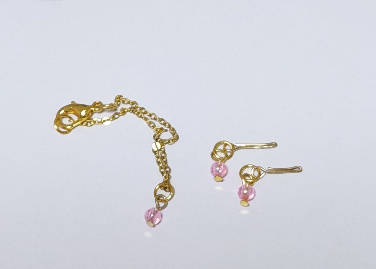 ・ドール用ネックレスとピアス…リカちゃん人形などの耳の穴にピアスを差し込んで着用させてください。ネックレスのチェーンは約10cm。丸カンにカニカンを取り付けるタイプです。