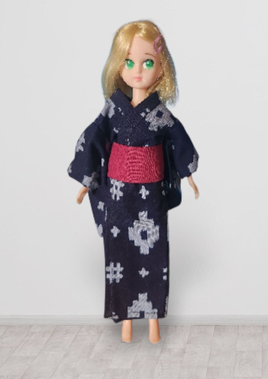 22㎝ドールサイズのアウトフィット二点セットです。紺色で和柄の浴衣とダークレッドの帯のセット。