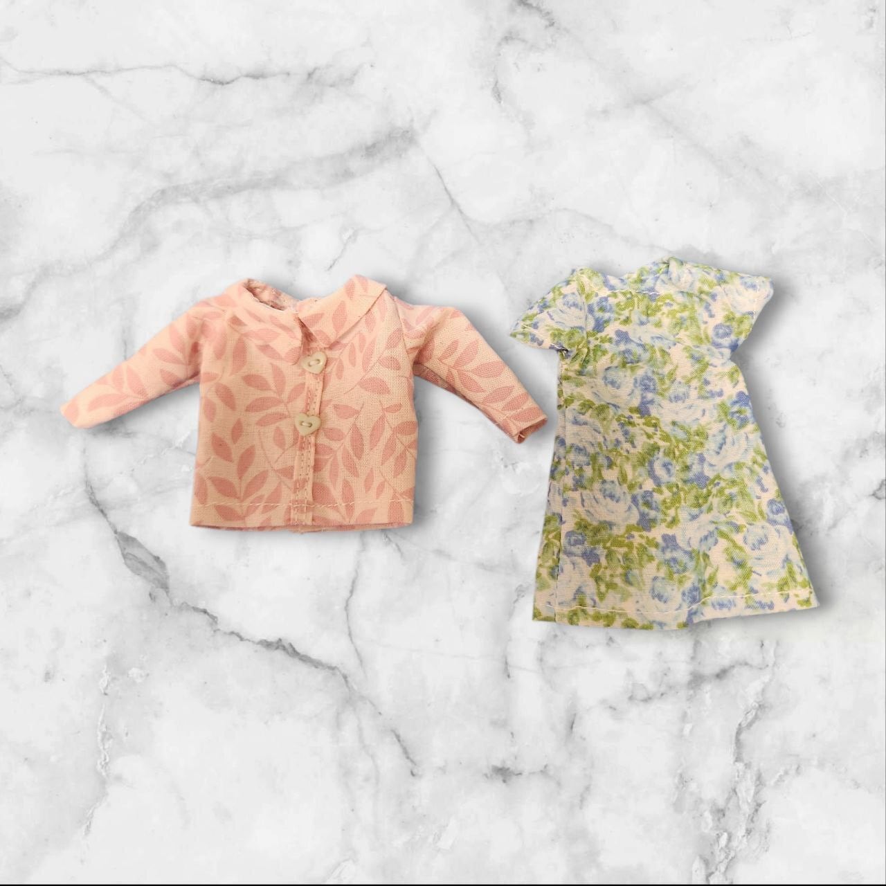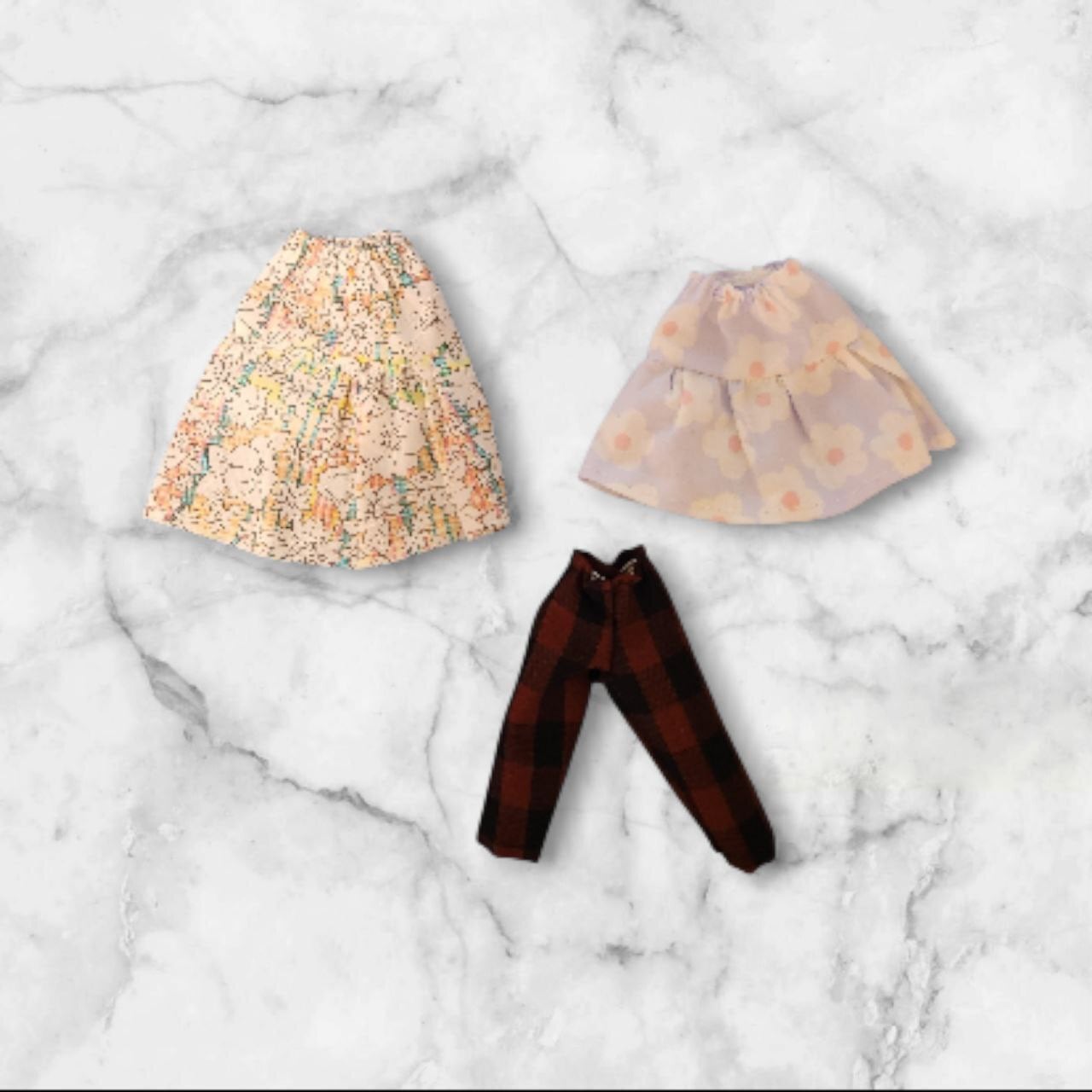 1/6ドール用アウトフィット5点セット。トップス二点とボトムス三点。普段着・カジュアル系の着回しコーデのイメージ。