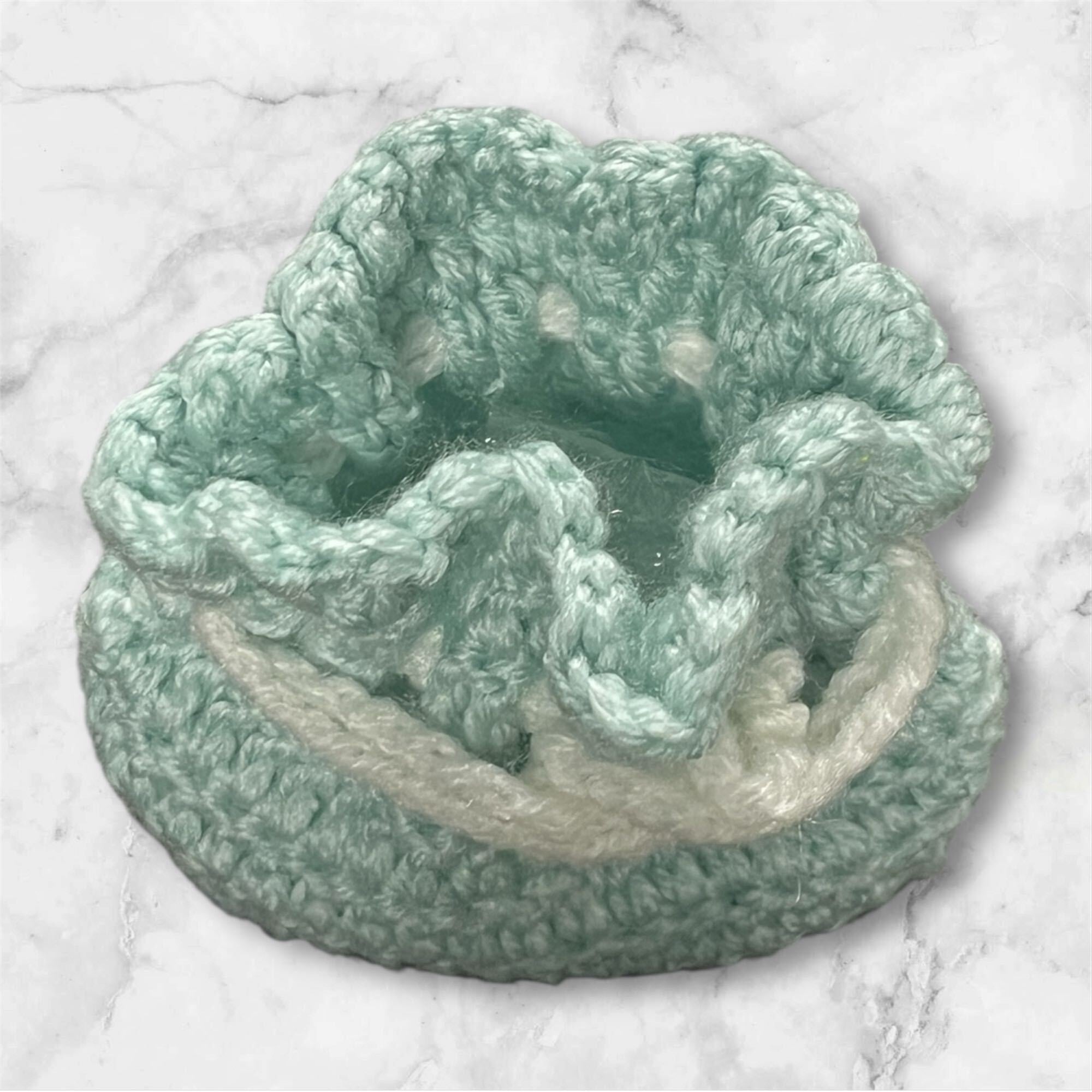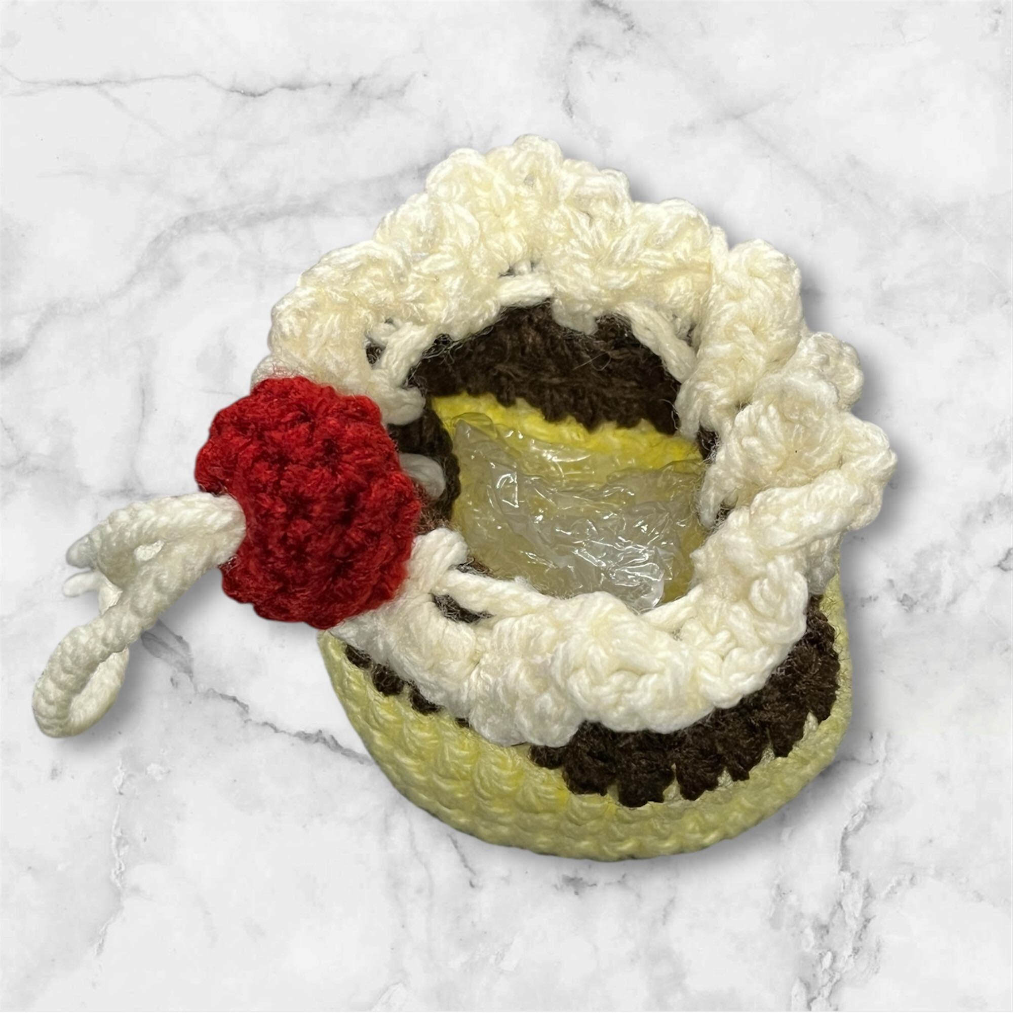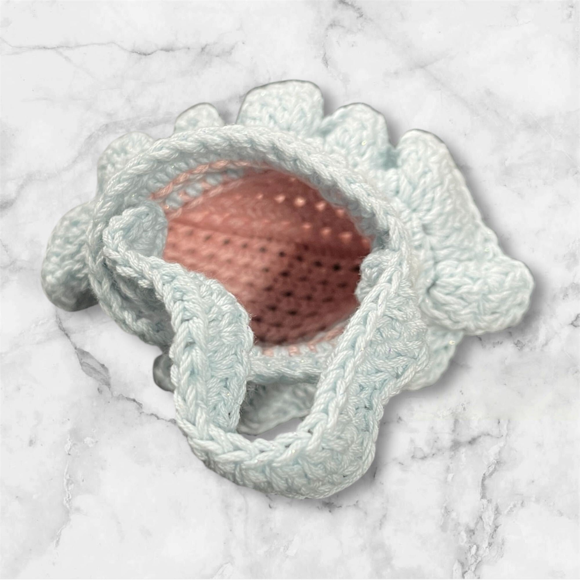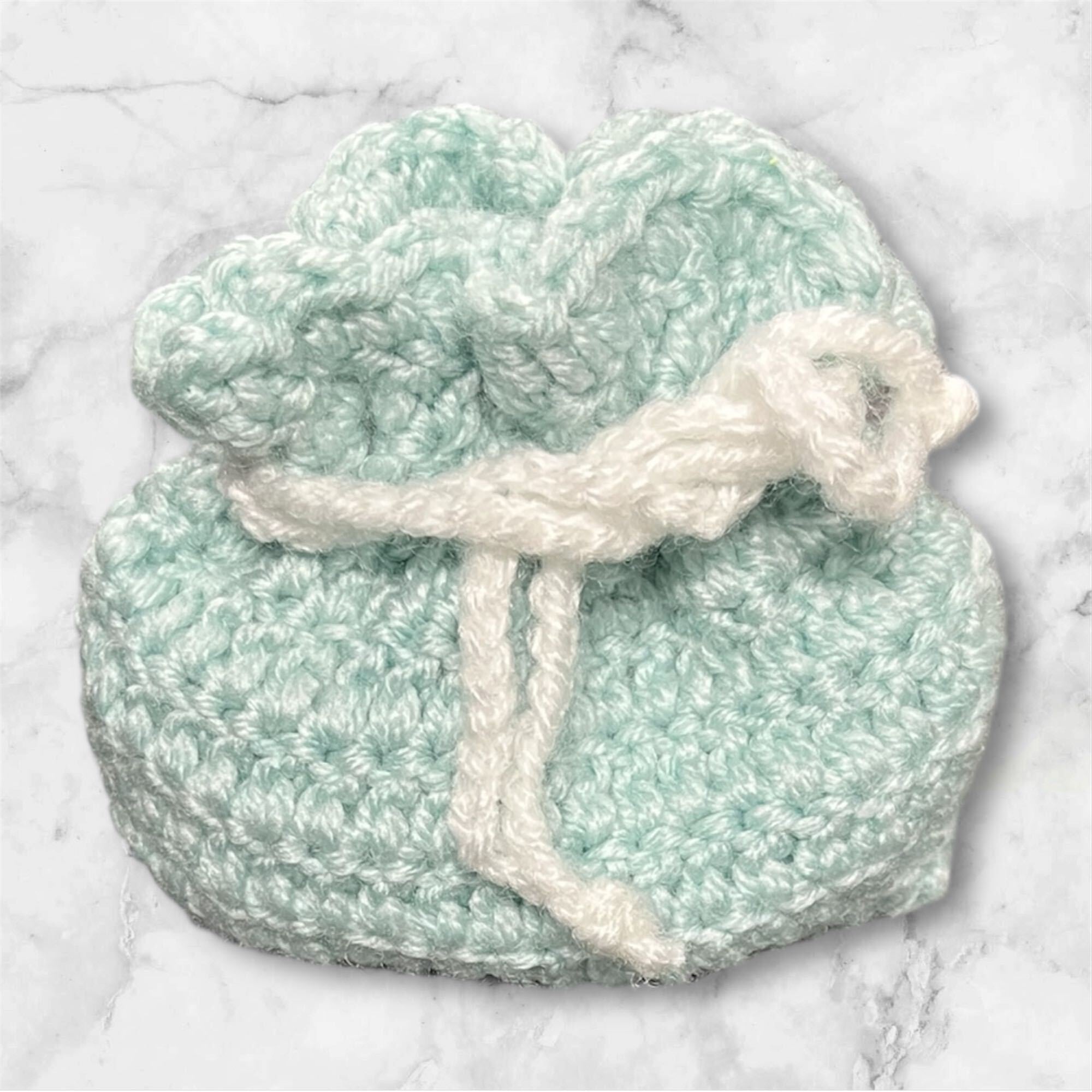 ひとつひとつ丁寧に編み上げた、プリンモチーフ・水色の巾着・ピンク×水色のミニバッグ型小物入れの3点セットです。