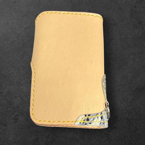 ナチュラルなヌメ革をベースに、グレー系の斑点模様の飾りをアクセントとして組み合わせたハンドメイドの4連キーケースです。