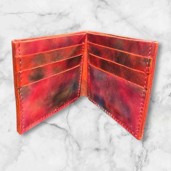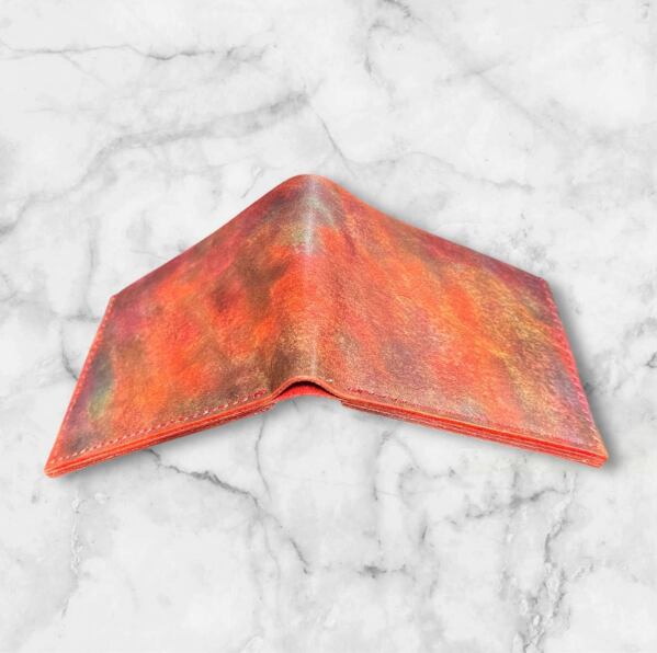 レザーで制作した赤茶グラデーション手染めの二つ折り財布です!