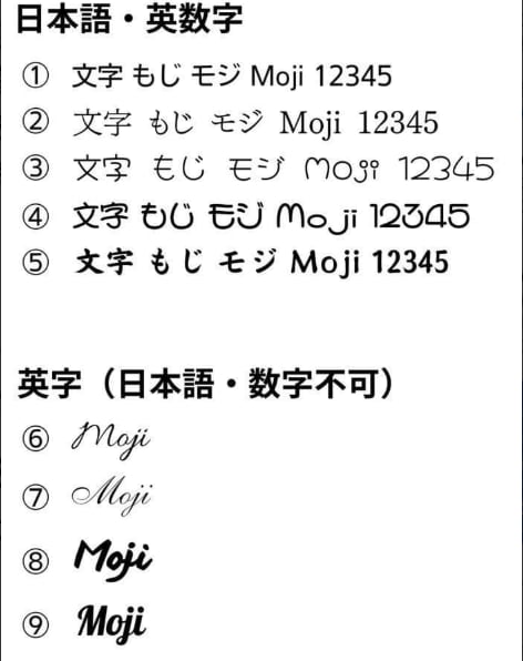 フォントは画像をご覧頂くか、好みのフォントがありましたら対応可能な場合もありますので、取引メッセージにてご相談ください。