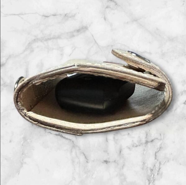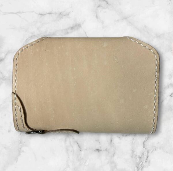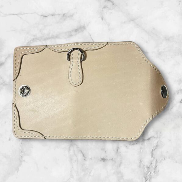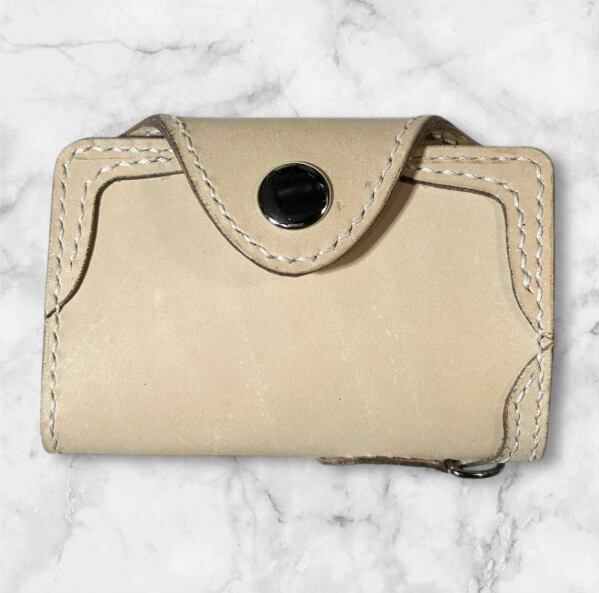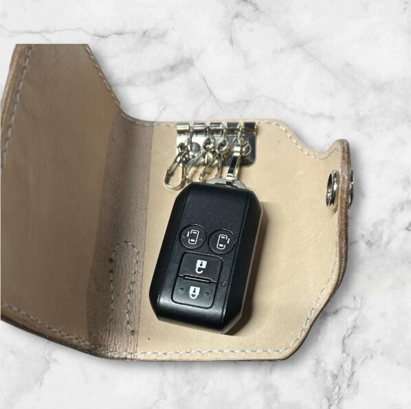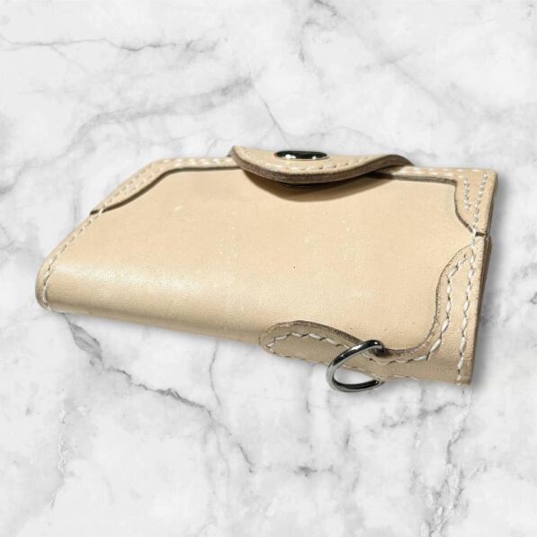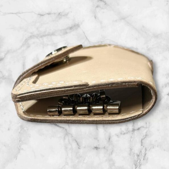 ナチュラルな生成り生地のヌメ革で制作した、角飾り付の4連キーケースです。