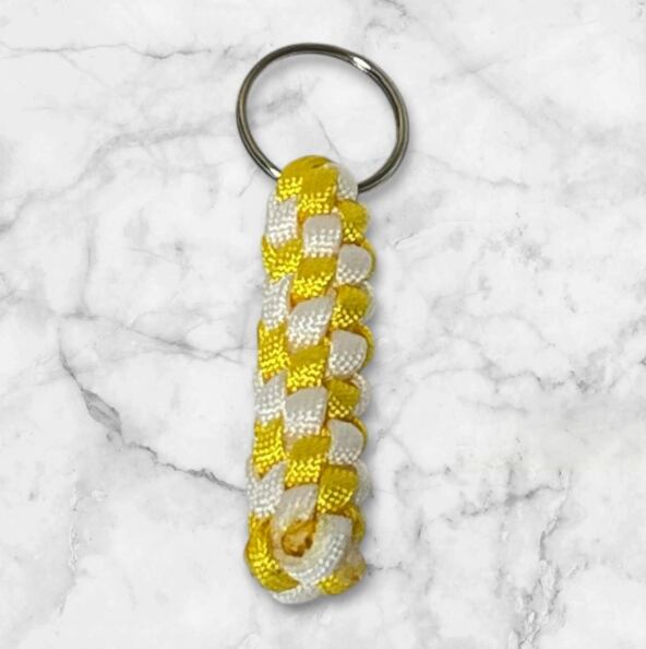 爽やかなイエローとホワイトの組み合わせが印象的なパラコードを丁寧に編み込んだキーホルダーです。