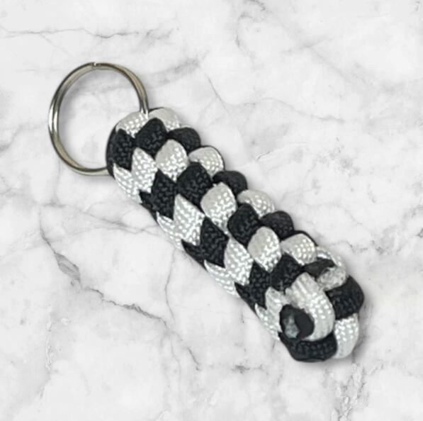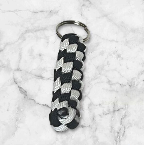 シンプルでかっこいい雰囲気のブラックとホワイトの組み合わせが印象的な、パラコードを丁寧に編み込んだキーホルダーです。