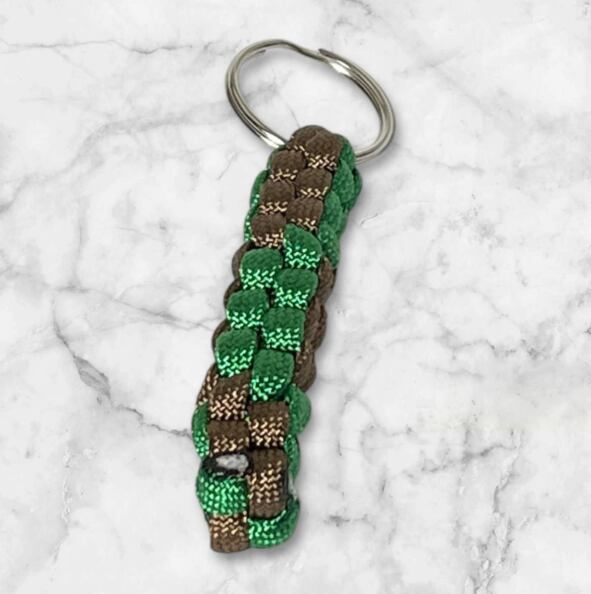 シックなグリーンとブラウンの組み合わせが印象的なパラコードを丁寧に編み込んだキーホルダーです。