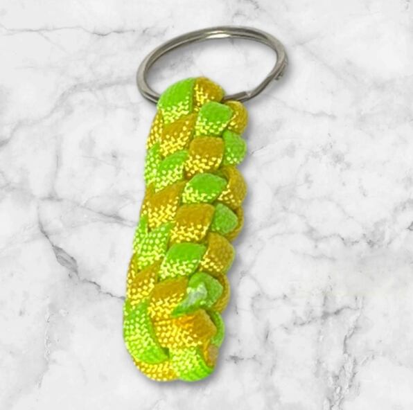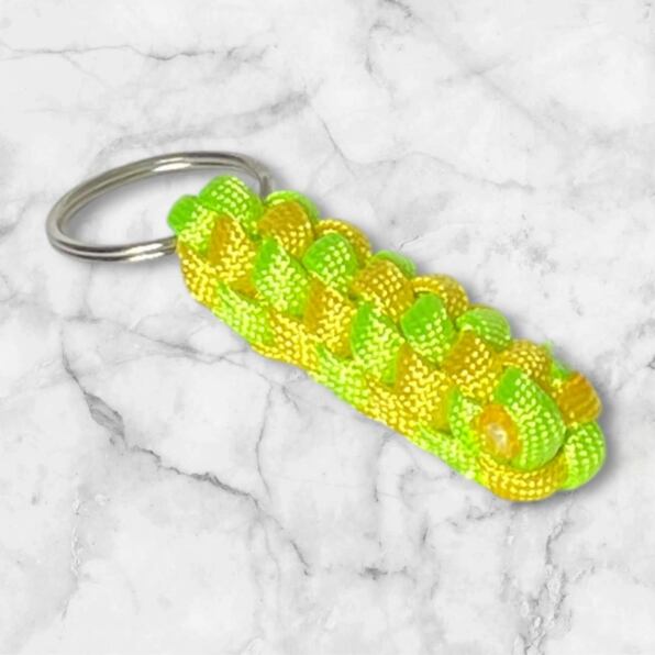 ポップで鮮やかなライトグリーンとイエローの組み合わせが印象的なパラコードを丁寧に編み込んだキーホルダーです。