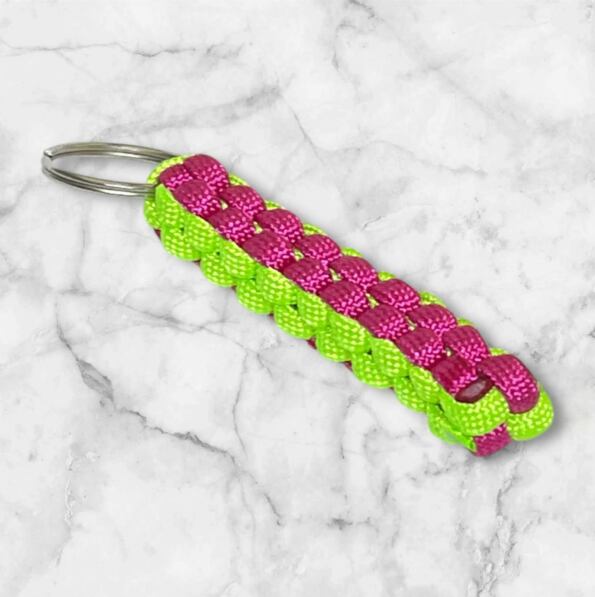 鮮やかでポップな雰囲気のピンクとグリーンの組み合わせのパラコードを丁寧に編み込んだキーホルダーです。