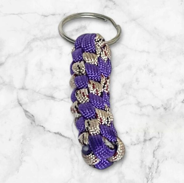 シックなパープルとベージュ系の組み合わせが印象的なパラコードを丁寧に編み込んだキーホルダーです。