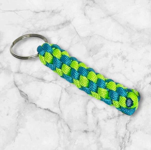 ポップなブルーとライトグリーンの組み合わせが特徴的なパラコードを丁寧に編み込んだキーホルダーです。