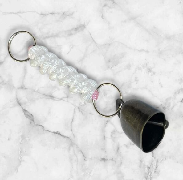 ホワイトとピンクの組み合わせのパラコードと熊よけ用の鈴を使用したハンドメイドキーホルダーです。