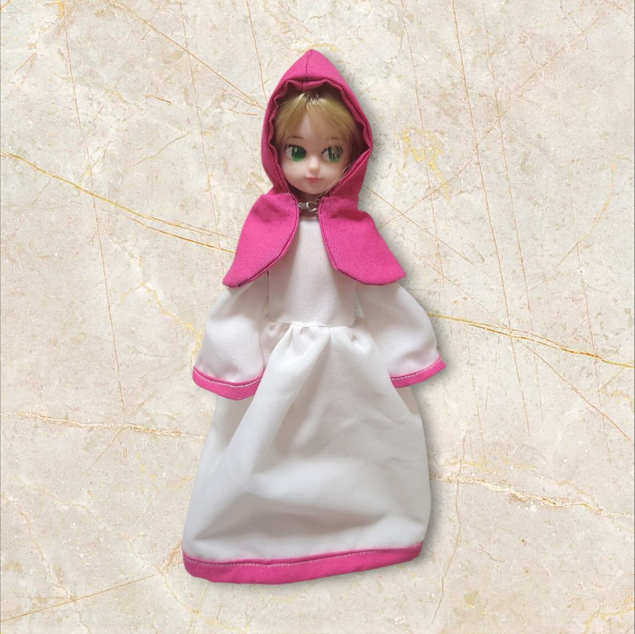 フード…濃いピンクのシーチング生地使用。ホックで止めるタイプ。リカちゃんくらいのヘッドのサイズ。