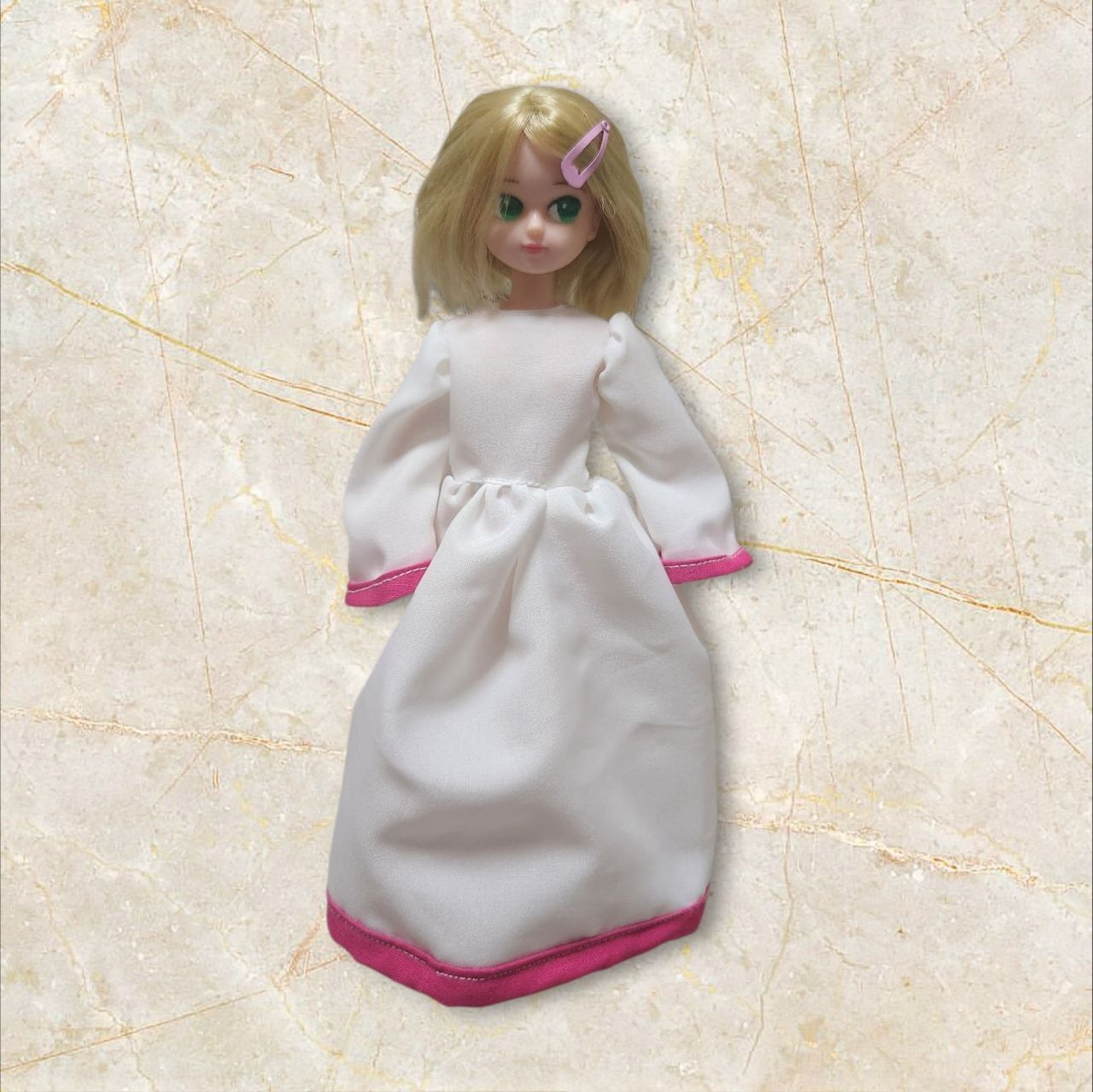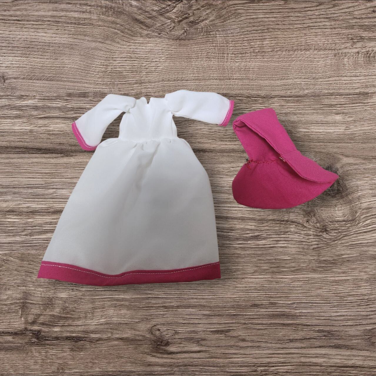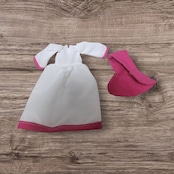 ワンピースドレス…白の薄い生地に濃いピンクのシーチング使用。後ろスナップボタンどめ。