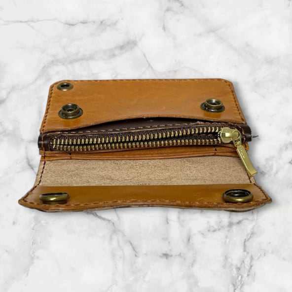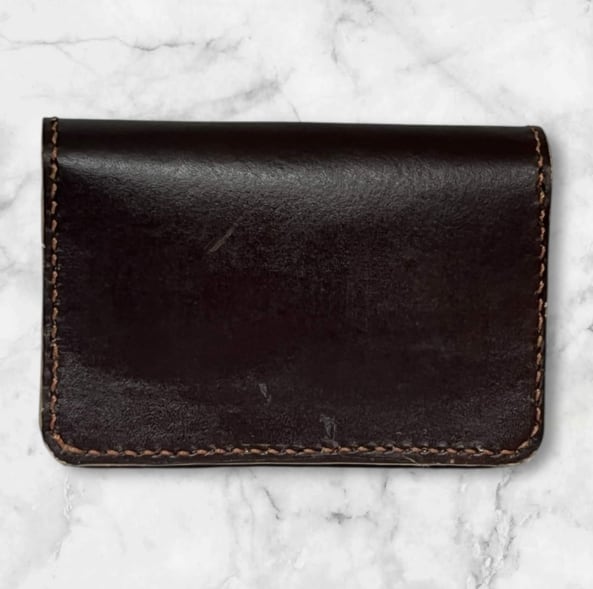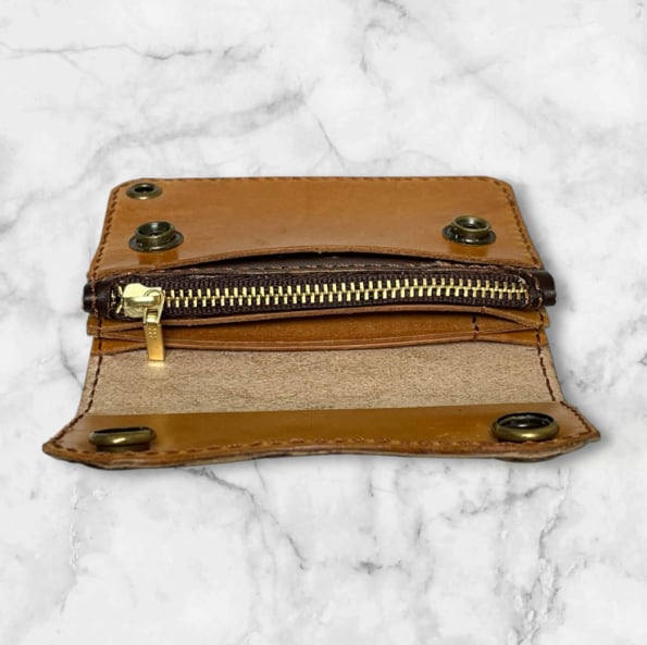濃いめの茶色と薄めの茶色の組み合わせの本革ハンドメイドミニウォレットです。