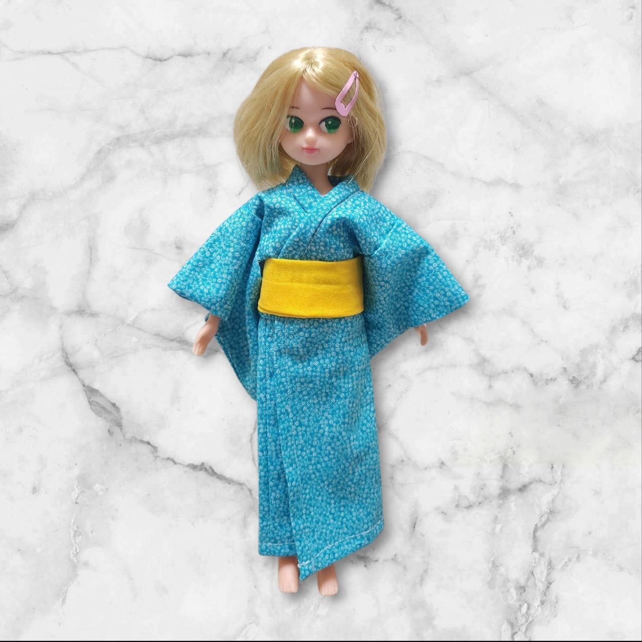 22㎝ドールサイズ向けのアウトフィット二点セットです。シンプルな水色×花柄の浴衣と黄色の帯のセット。