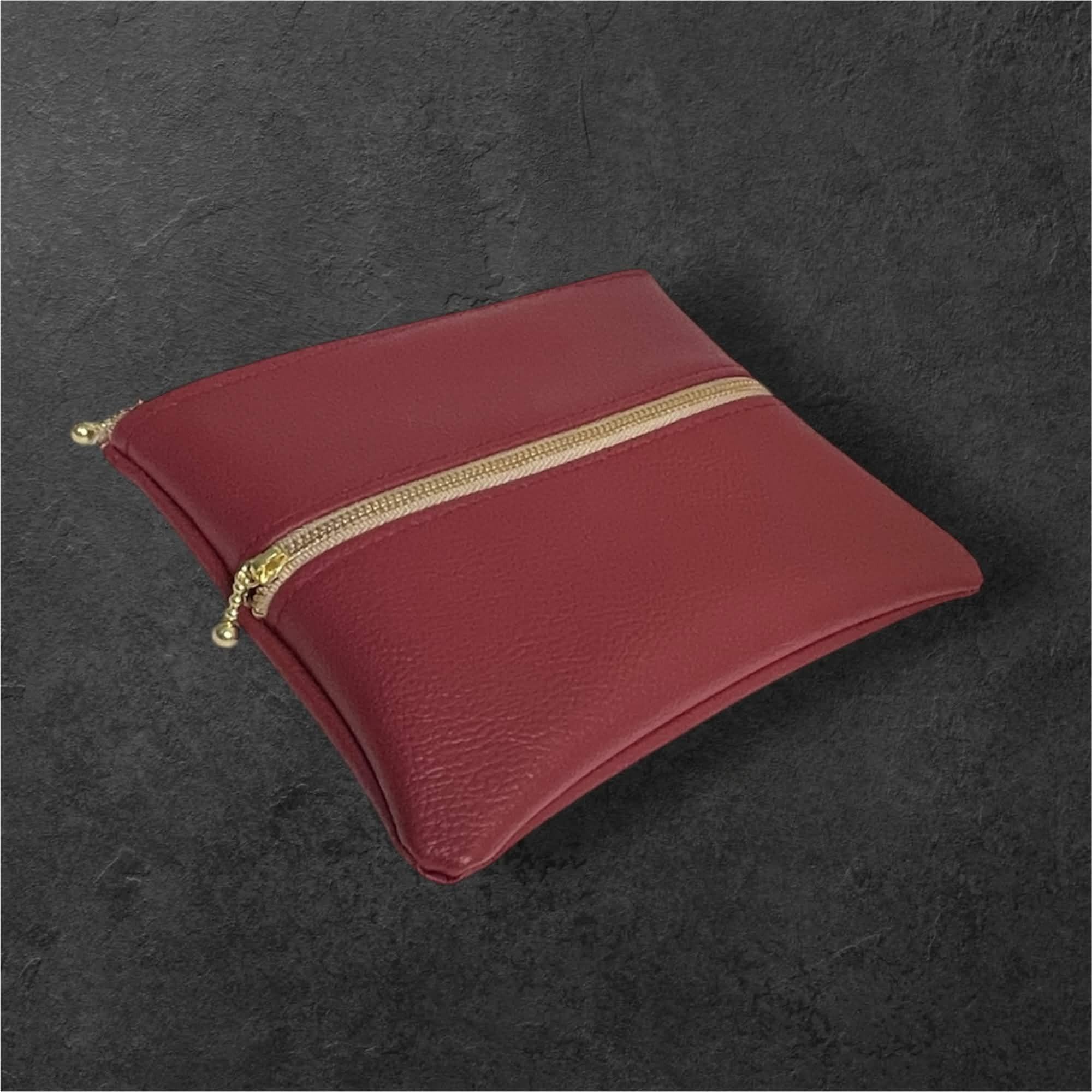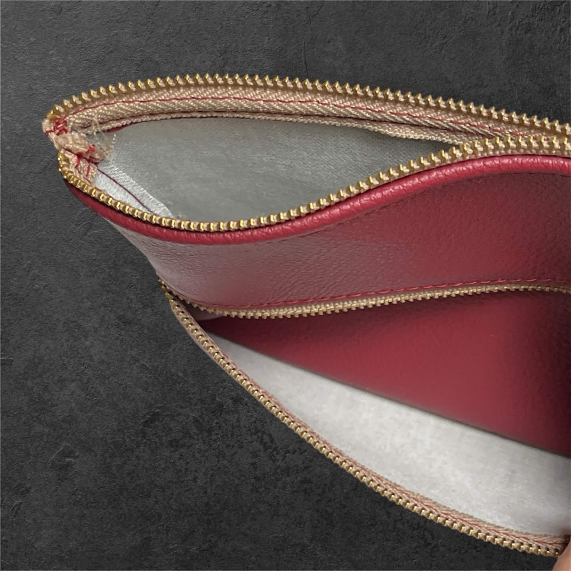上品なレッドカラーが目を引く、シンプルで使いやすいダブルファスナータイプのマルチポーチです。