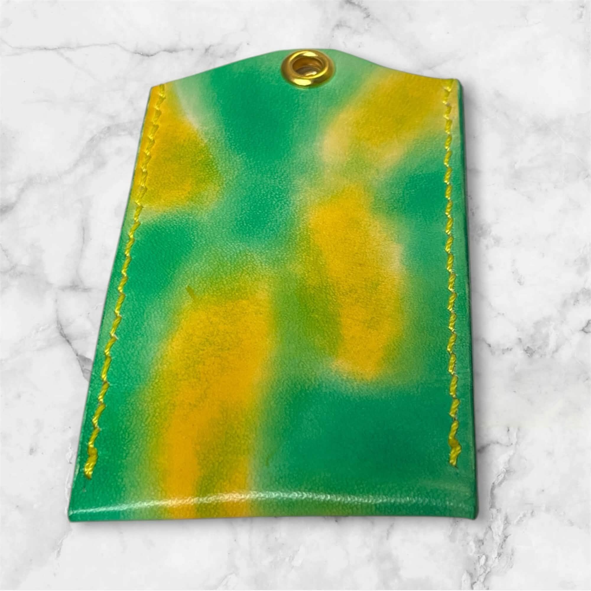 緑と黄色の手染めのお守りレザーケース(Lサイズ)です。