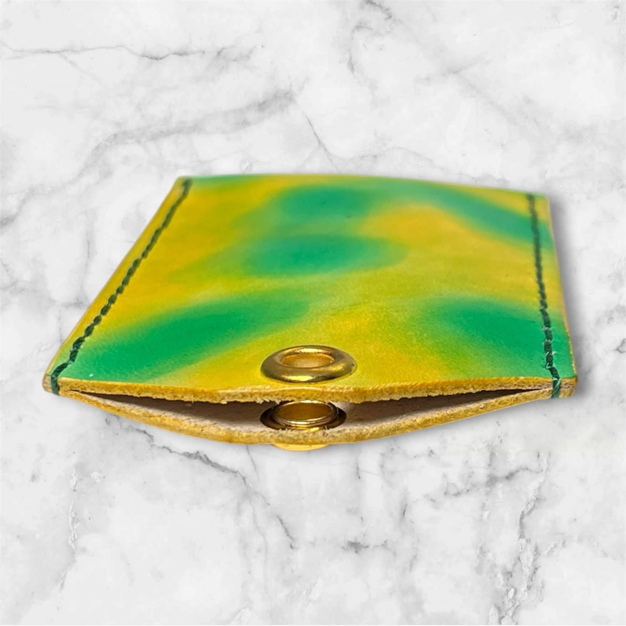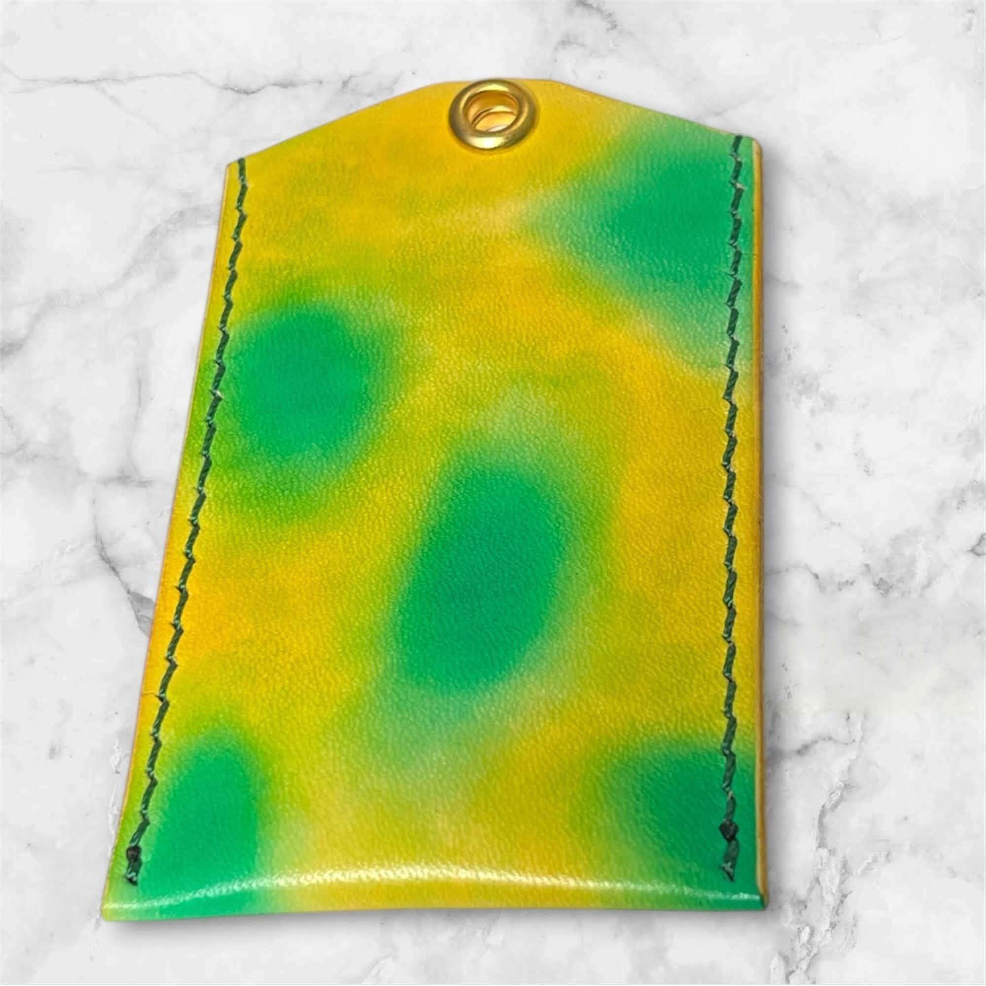 黄色と緑色の手染めのお守りレザーケース(Lサイズ)です。